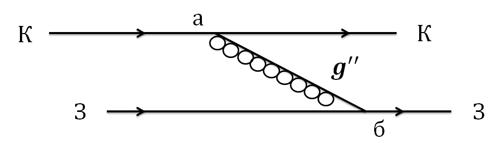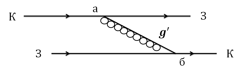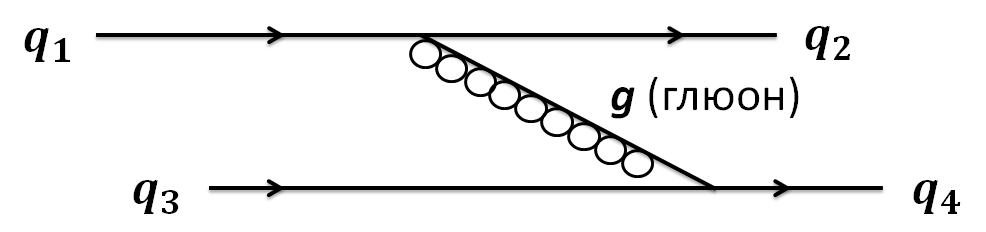 Диаграмма взаимодействия двух кварков посредством обмена глюоном, при котором их