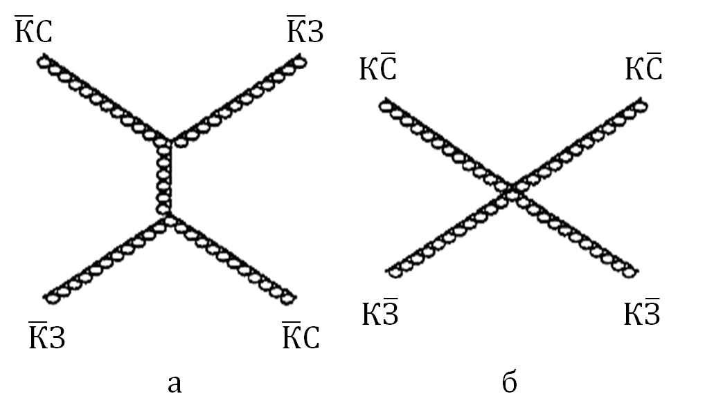 Примеры диаграмм рассеяния глюона на глюоне: а) посредством испускания виртуального глюона; б) прямого клюонного рассеяния |